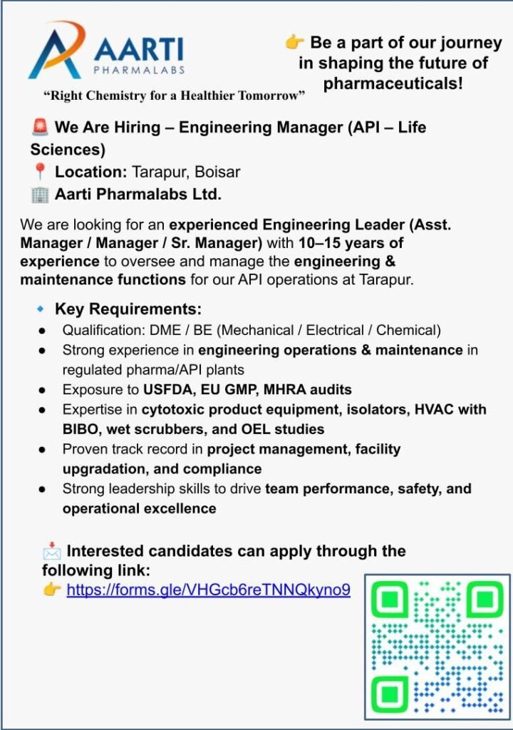 We are looking for an experienced Engineering Leader (Manager / Sr. Manager) with 12β17 years of experience to oversee and manage the engineering & maintenance functions for our API operations at Tarapur.