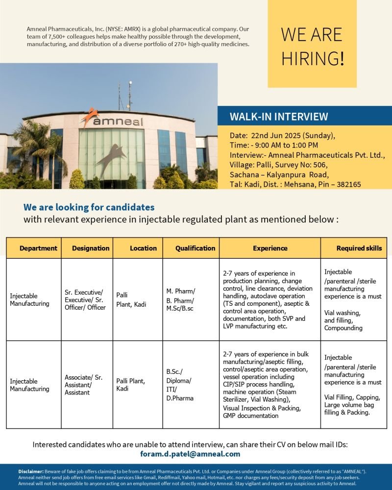 Walk-in Drive @ Palli – Kadi location for Manufacturing department (Injectable) on 22nd Jun 2025 (Sunday)