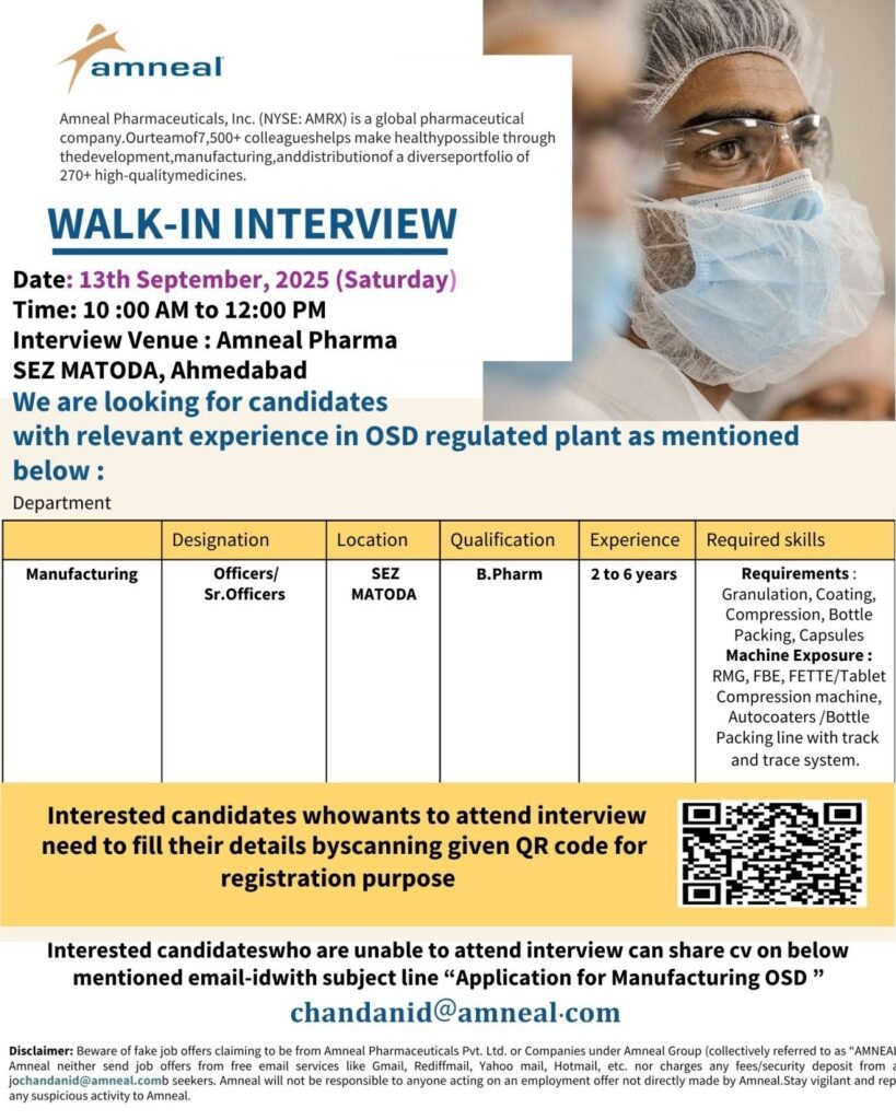 Disclaimer: Beware of fake job offers claiming to be from Amneal Pharmaceuticals Pvt. Ltd. or Companies under Amneal Group (collectively referred to as “AMNEAL Amneal neither send job offers from free email services like Gmail, Rediffmail, Yahoo mail, Hotmail, etc. nor charges any fees/security deposit from a jochandanid@amneal.comb seekers. Amneal will not be responsible to anyone acting on an employment offer not directly made by Amneal.Stay vigilant and rep any suspicious activity to Amneal.