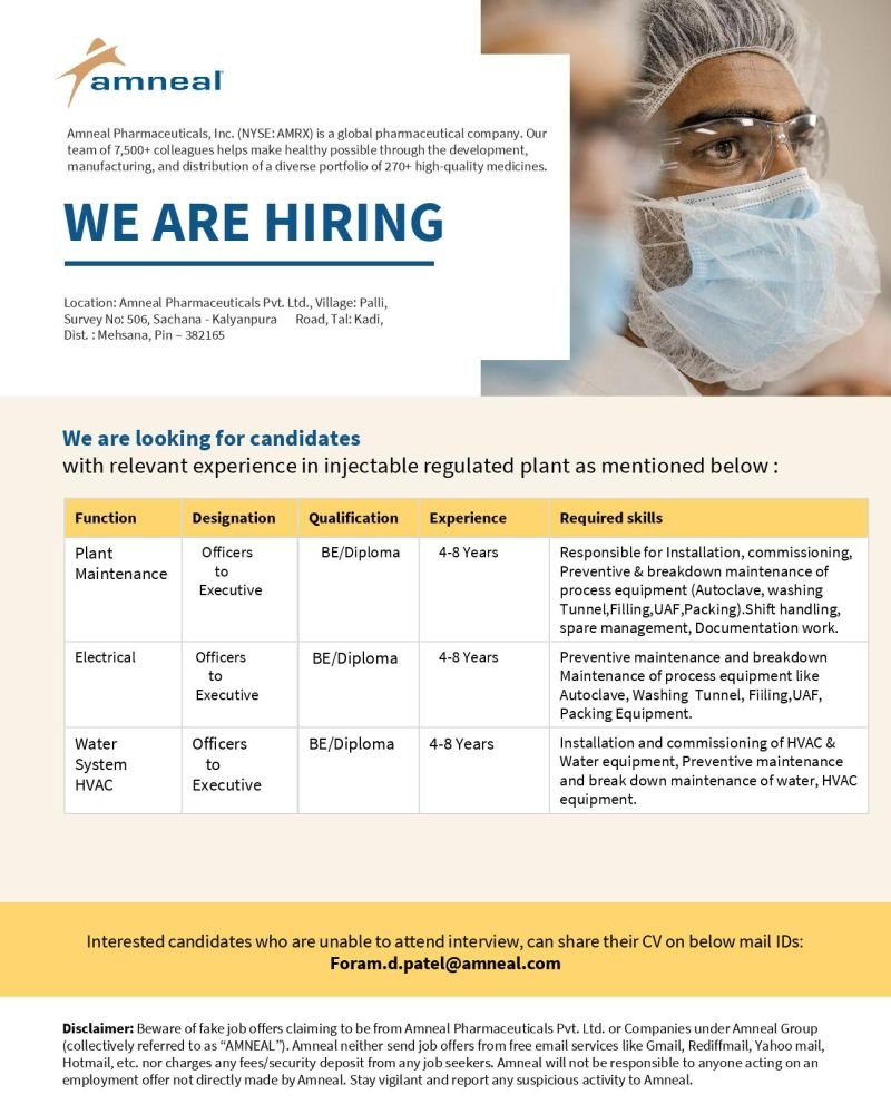 Interested candidates can share their profiles at 📧foram.d.patel@amneal.com with subject line “Profile for Project & Engineering”.