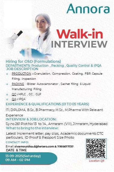 Annora Pharma is hiring for Production, Packing, QC & IPQA Departments