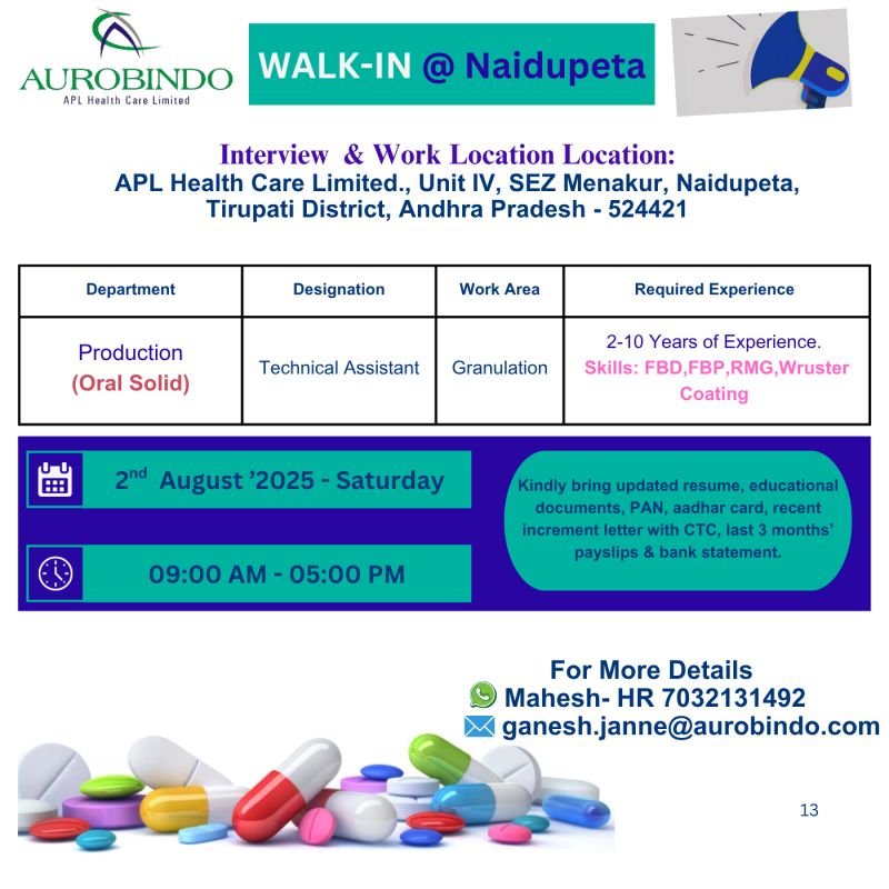 Are you looking to advance your career in pharmaceutical production? Weโ€™re hiring Technical Assistants for our Production (Oral Solid) team at APL Health Care Limited, Unit IV, SEZ Menakur, Naidupeta, Andhra Pradesh.