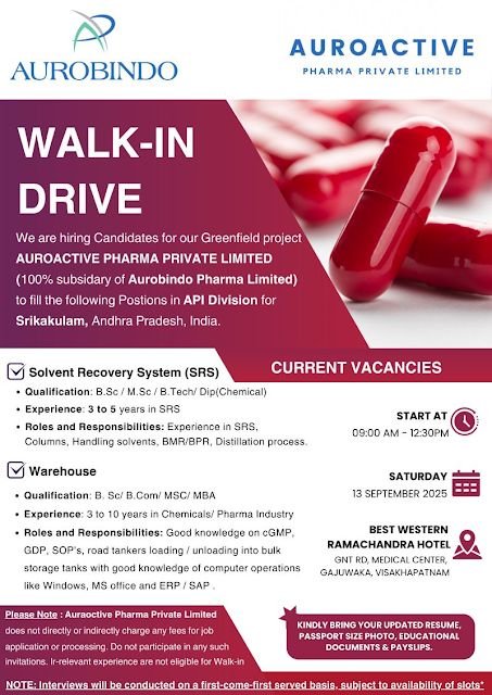 Please Note: Auraoctive Pharma Private Limited does not directly or indirectly charge any fees for job application or processing. Do not participate in any such invitations. Ir-relevant experience are not eligible for Walk-in