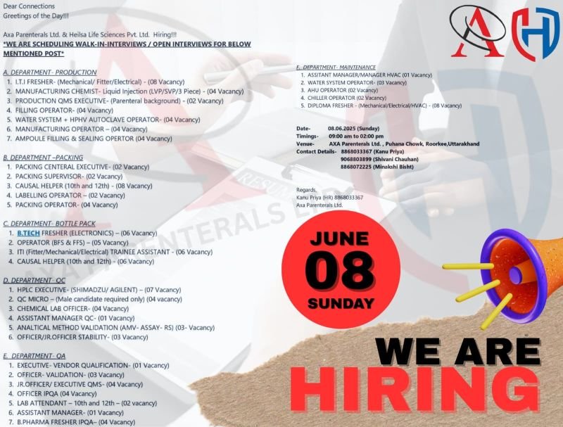 Axa Parenterals Ltd. & Heilsa Life Sciences Pvt. Ltd. Hiring!!!