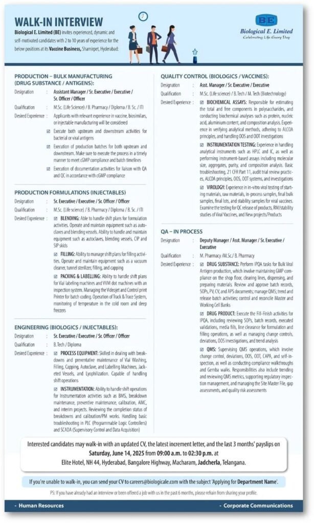 Biological E. Limited (BE) invites experienced, dynamic and self-motivated candidates with 2 to 10 years of experience for the below positions at its Vaccine Business, Shamirpet, Hyderabad: