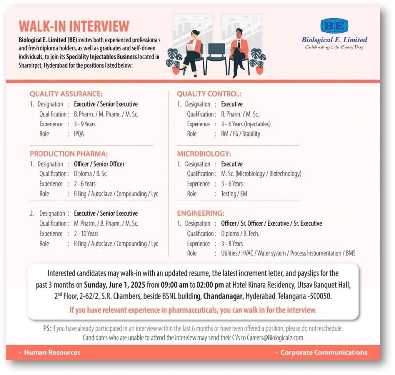 Biological E. Limited (BE) invites both experienced professionals and fresh diploma holders, as well as graduates and self-driven individuals, to join its Speciality Injectables Business located in Shamirpet, Hyderabad for the positions listed below: