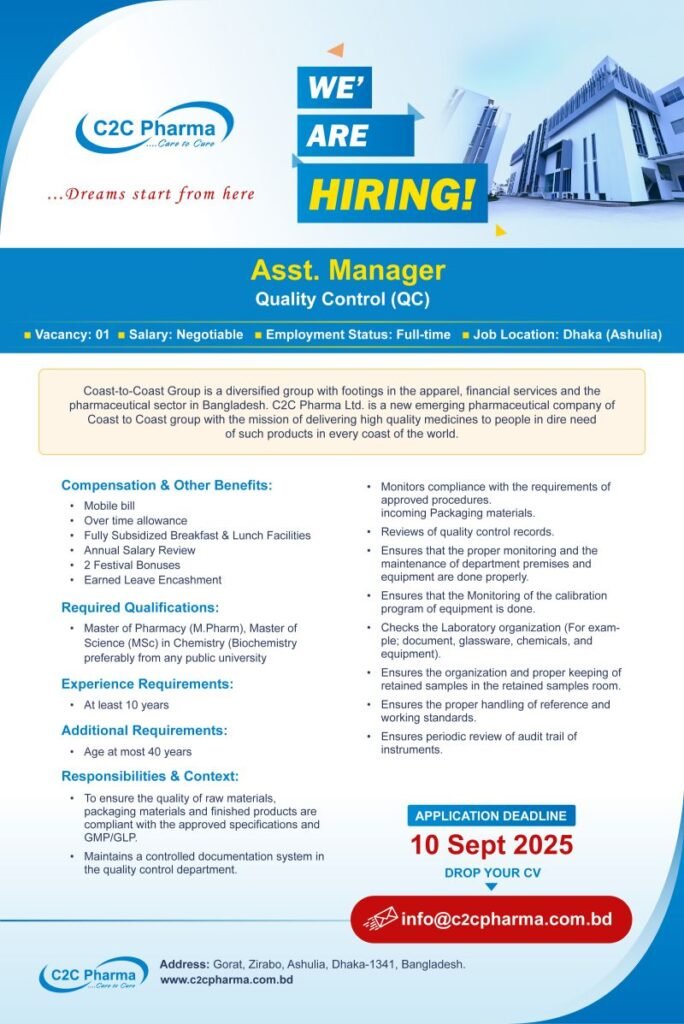C2C Pharma Ltd is hiring for Quality Control Department