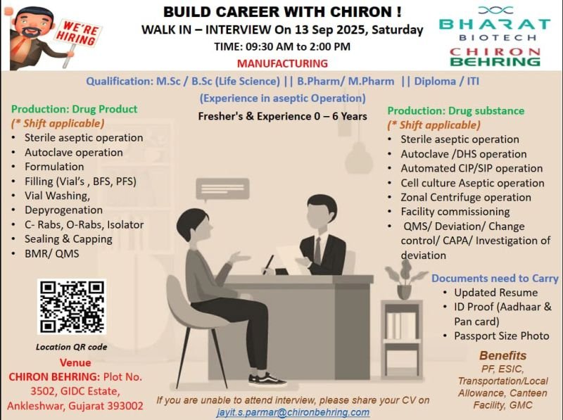 Candidates unable to attend may share their CV at jayit.s.parmar@chironbehring.com