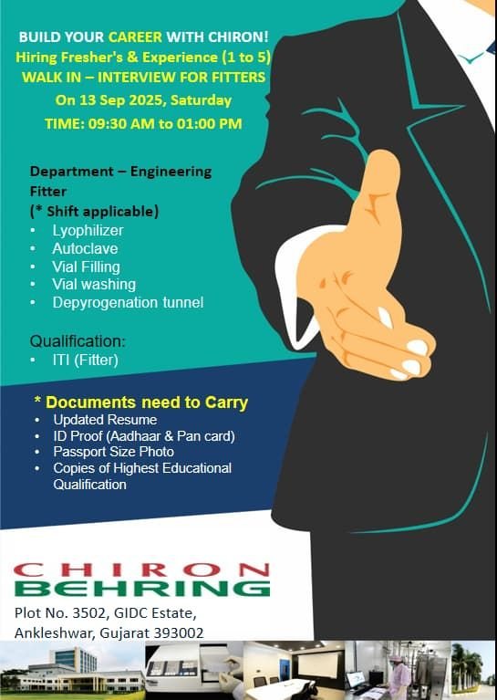 📍 Venue: Chiron Behring, Plot No. 3502, GIDC Estate, Ankleshwar, Gujarat – 393002