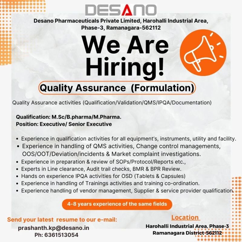 Qualification: M.Sc/B.pharma/M.Pharma.