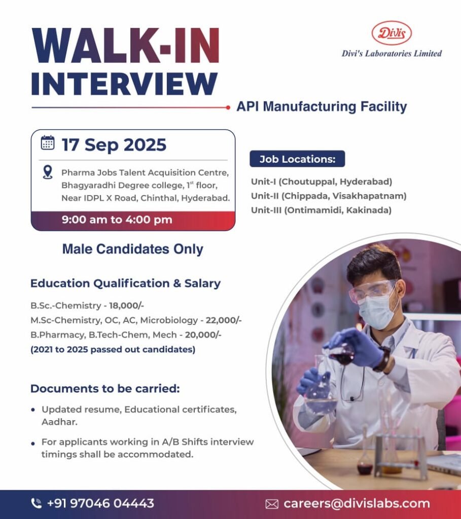 Venue: Pharma Jobs Talent Acquisition Centre, Bhagyaradhi Degree college, 1st floor, Near IDPL X Road, Chinthal, Hyderabad.