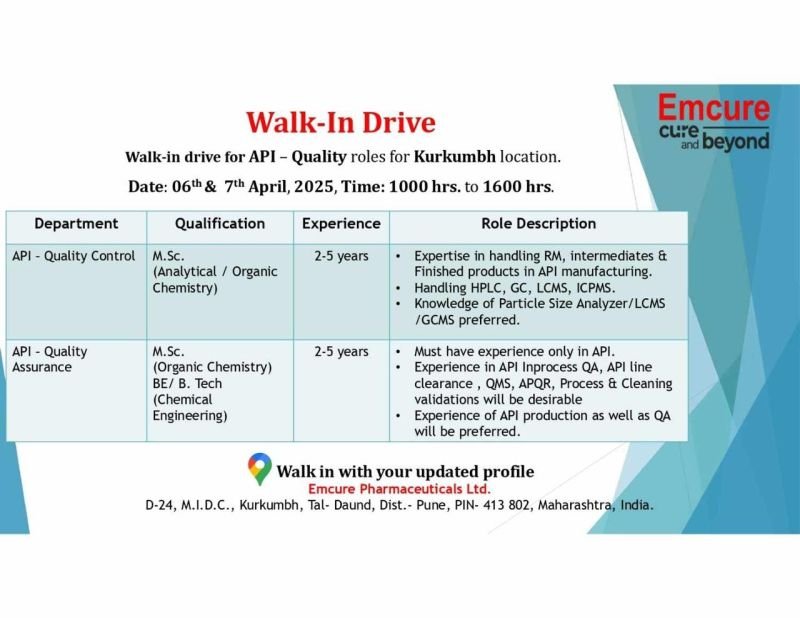 Emcure Pharmaceuticals is conducting Walk in Drive for API-Quality roles at Kurkumbh location on Sunday, April 6 & Monday April 7, 2025 from 1000 hrs. to 1600 hrs.