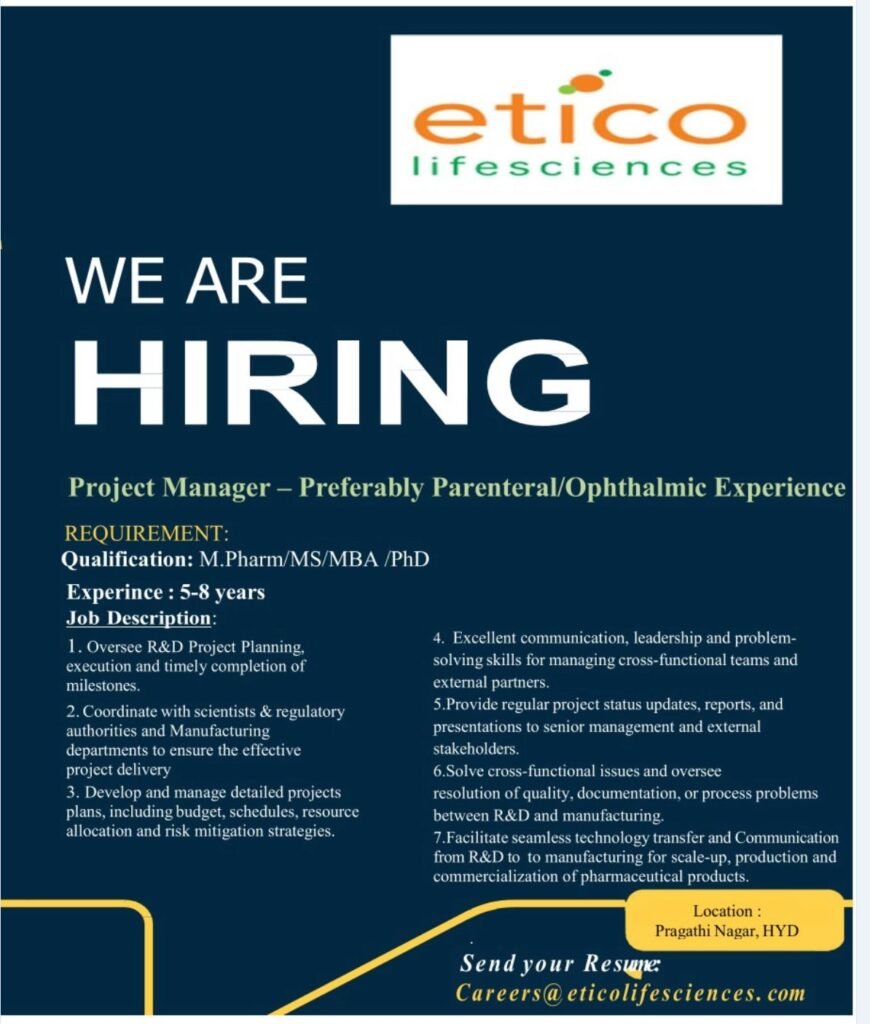 Project Manager – Preferably Parenteral/Ophthalmic Experience