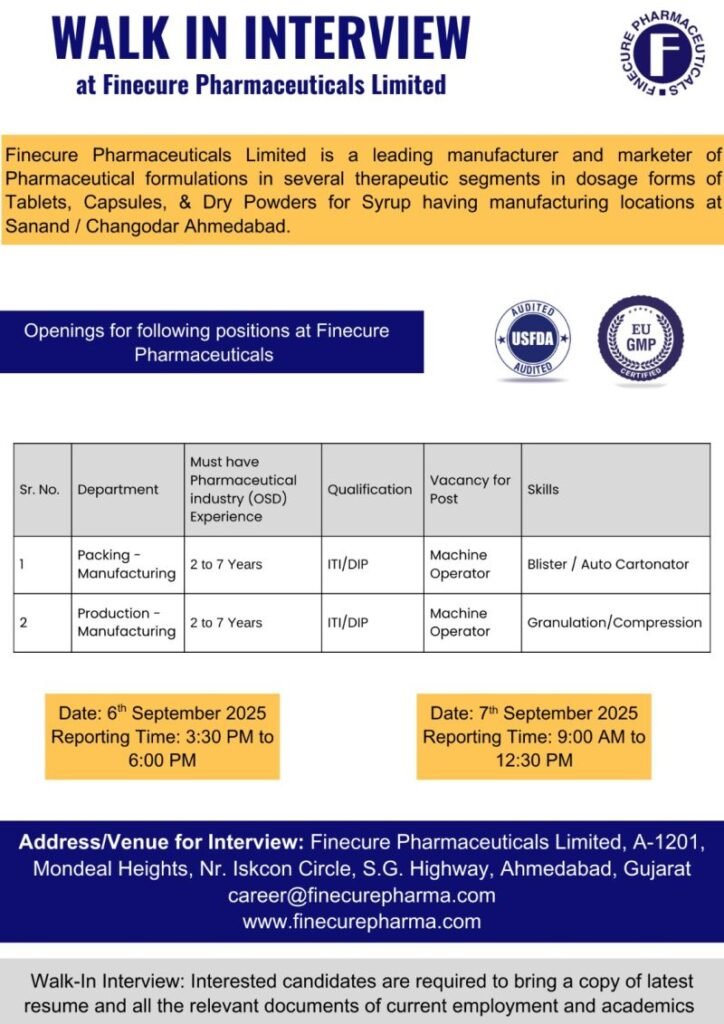 Walk-In Interview at Finecure Pharmaceuticals Limited!