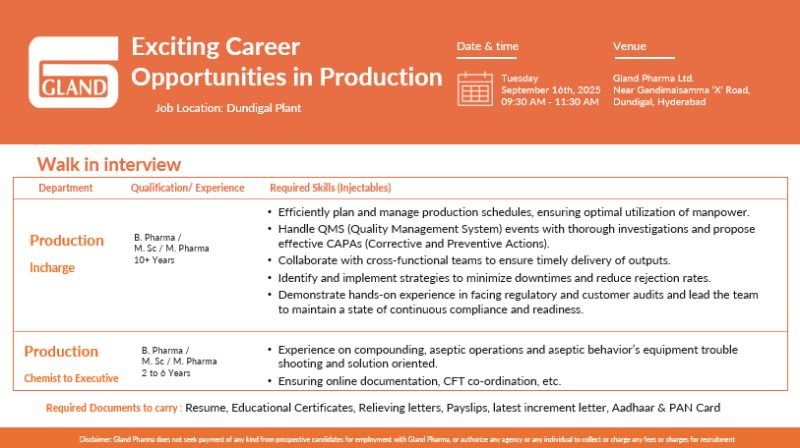 Disclaimer: Gland Pharma does not seek payment of any kind from prospective candidates for employment with Gland Pharma, or authorize any agency or any individual to collect or charge any fees or charges for recrutent