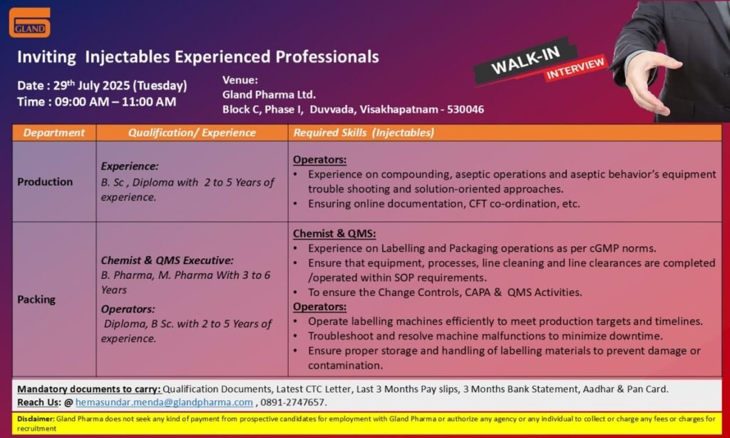 Venue: Gland Pharma Ltd. Block C, Phase I, Duvvada, Visakhapatnam – 530046