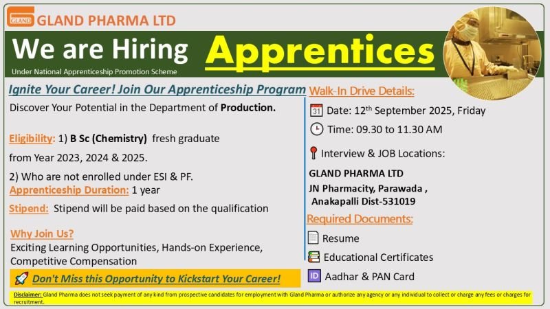 Interview & JOB Locations: GLAND PHARMA LTD JN Pharmacity, Parawada, Anakapalli Dist-531019