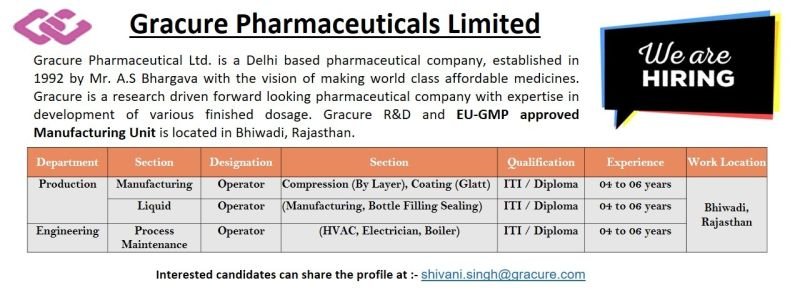 Gracure Pharmaceuticals Limited is hiring below given profiles. Interested candidates can share resumes at shivani.singh@gracure.com