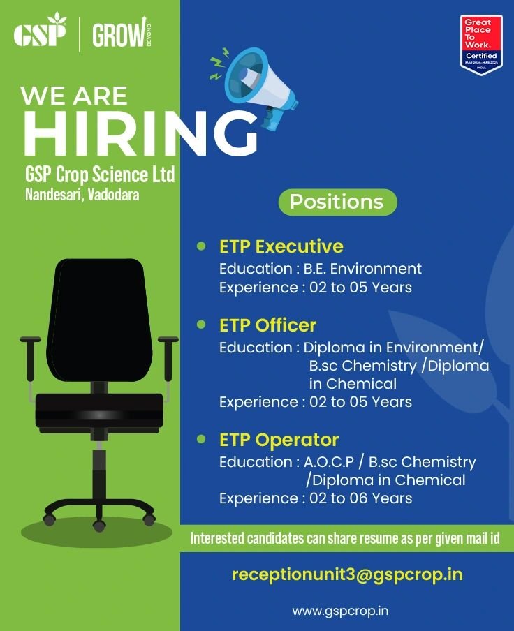 GSP Crop Science is hiring for ETP Executive, ETP Officer & ETP Operator