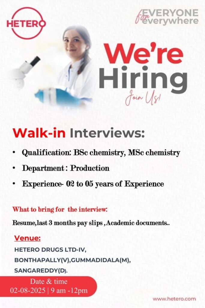 We are glad to announce that Hetero Drugs Ltd – Unit IV is conducting Walk-In Interviews for experienced professionals in the Production Department.