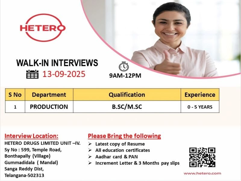 📍 Location: Hetero Drugs Ltd – Unit IV, Bonthapally Village, Gummadidala Mandal, Sangareddy District