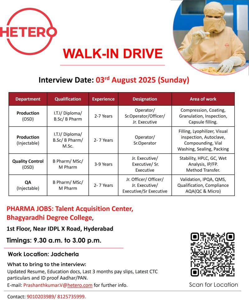 📢 HETERO is conducting a Walk-In Drive for talented professionals in Production (OSD & Injectable), Quality Control (OSD), and Quality Assurance (Injectable).