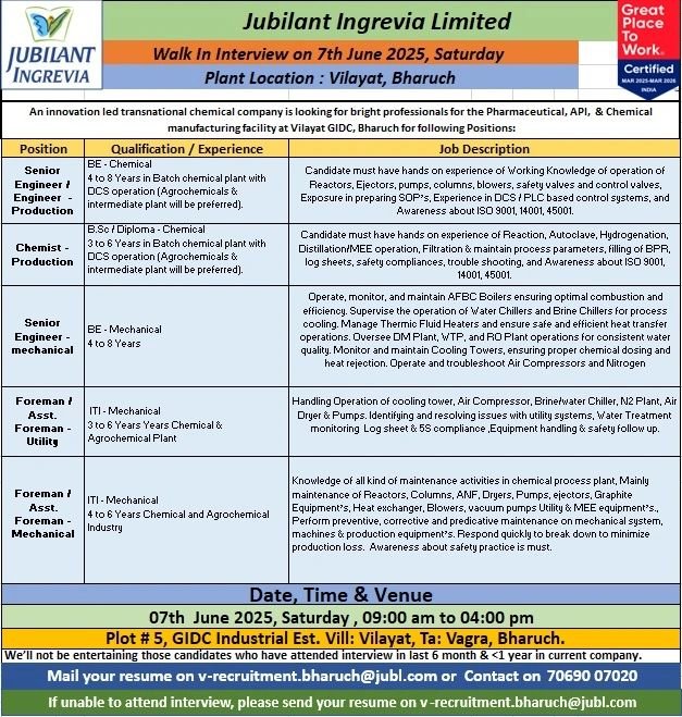 If unable to attend interview, please send your resume on v-recruitment.bharuch@jubl.com