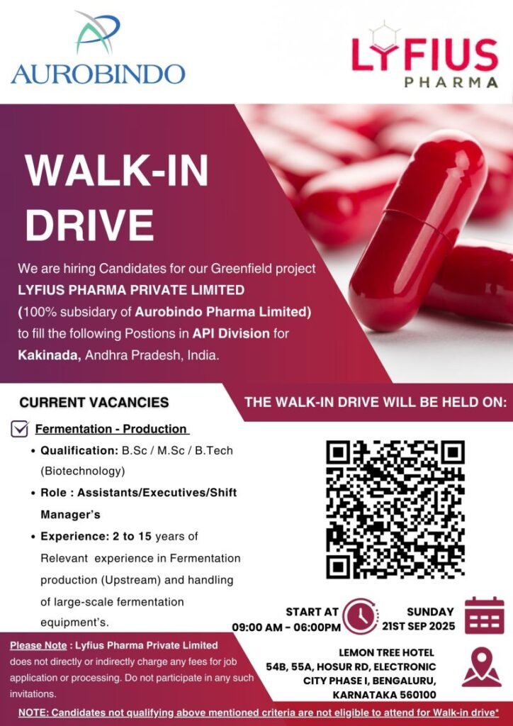 We are hiring Candidates for Lyfius Pharma Private Limited (100% subsidiary of Aurobindo Pharma Limited) to fill the following Position in API Division for Kakinada, Andhra Pradesh, India.