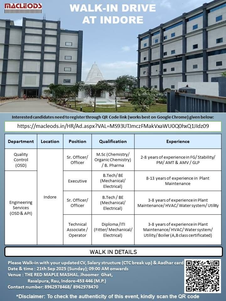Interested candidates need to register through QR Code link (works best on Google Chrome) given below: https://macleods.in/HR/Ad.aspx?VAL=MS93UTJmcz FMakVxaWU0Q0hxQ1ldz09