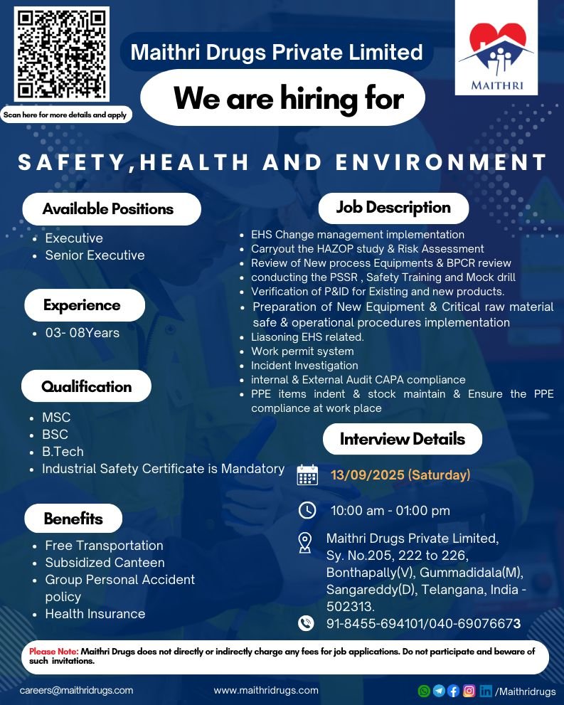 We are Hiring for the Safety, Health & Environment Department at Maithri Drugs Private Limited
