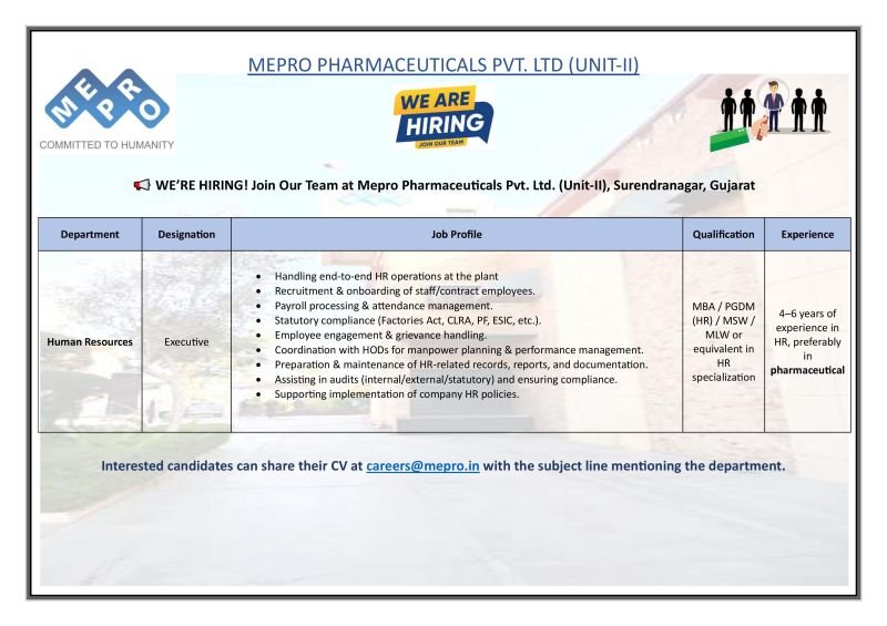 Mepro Pharmaceuticals Pvt. Ltd. (Unit-II), Surendranagar is looking for an HR professional to join our growing team.