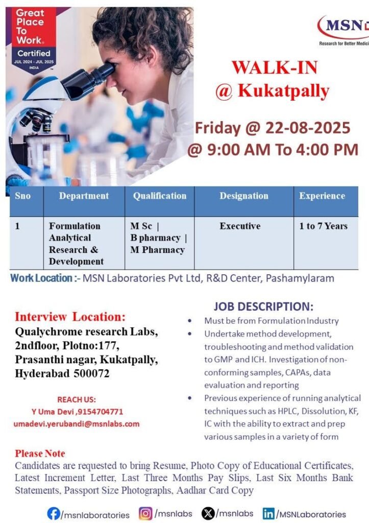 Walk In drive for Formulation Analytical Research & Development – department (FAR&D) – Qualychrome Research Labs, H.No.5-5-35/128, plot no.177, near Venkateswara Swamy temple, Prashanti Nagar, Kukatpally, Hyderabad, Telangana on Saturday 22-08-2025.