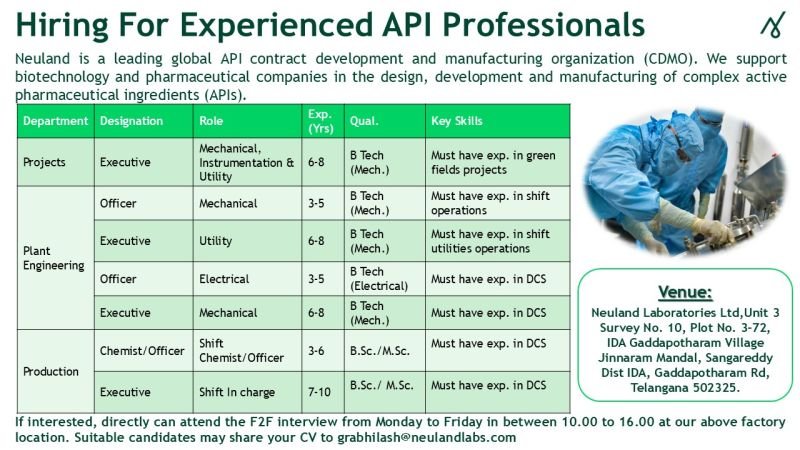 If interested, directly can attend the F2F interview from Monday to Friday in between 10.00 to 16.00 at our above factory location. Suitable candidates may share your CV to grabhilash@neulandlabs.com