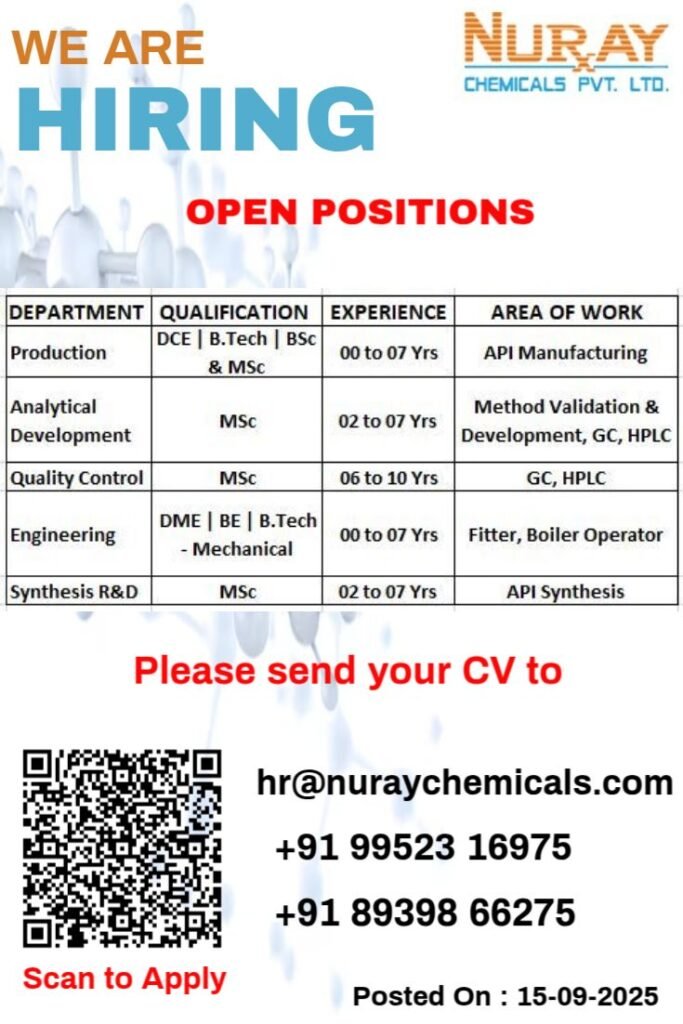 In Nuray Chemicals Pvt Ltd having Multiple Opening is there, Interested Candidate Pl share the resume to the below mentioned Mail ID & whatsapp Number & also immediate joiner preferred.