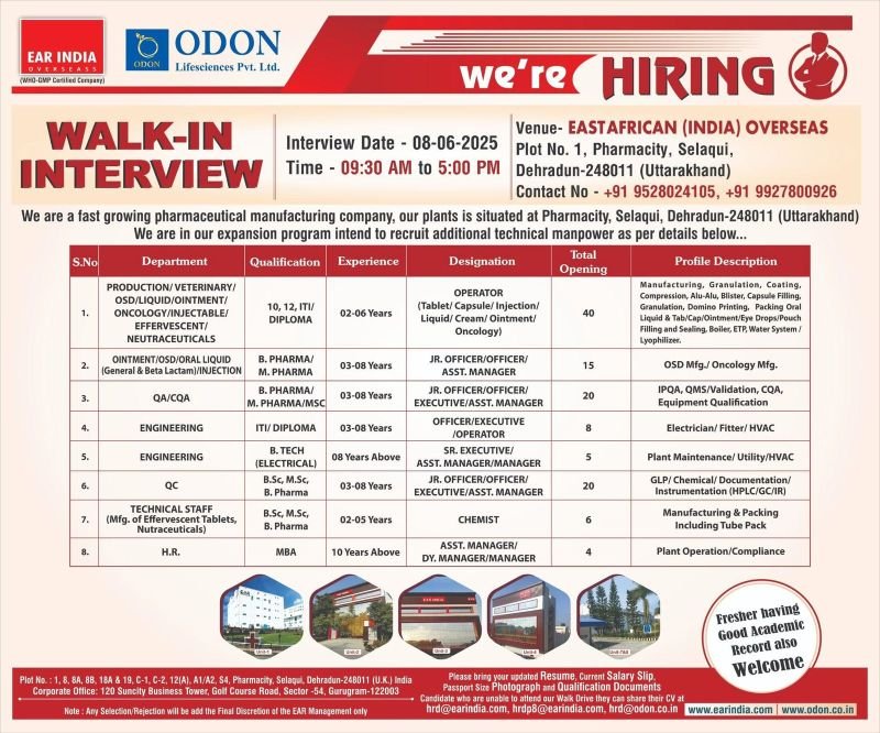 We are a fast growing pharmaceutical manufacturing company, our plants is situated at Pharmacity, Selaqui, Dehradun-248011 (Uttarakhand) We are in our expansion program intend to recruit additional technical manpower as per details below…