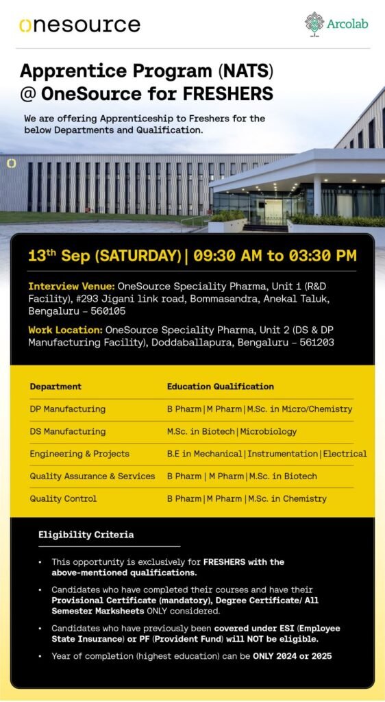 📍 Venue: OneSource Specialty Pharma, Unit 1 – R&D Facility, Jigani Link Road, Bommasandra, Bengaluru – https://lnkd.in/gn4QU9M3