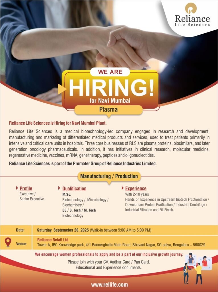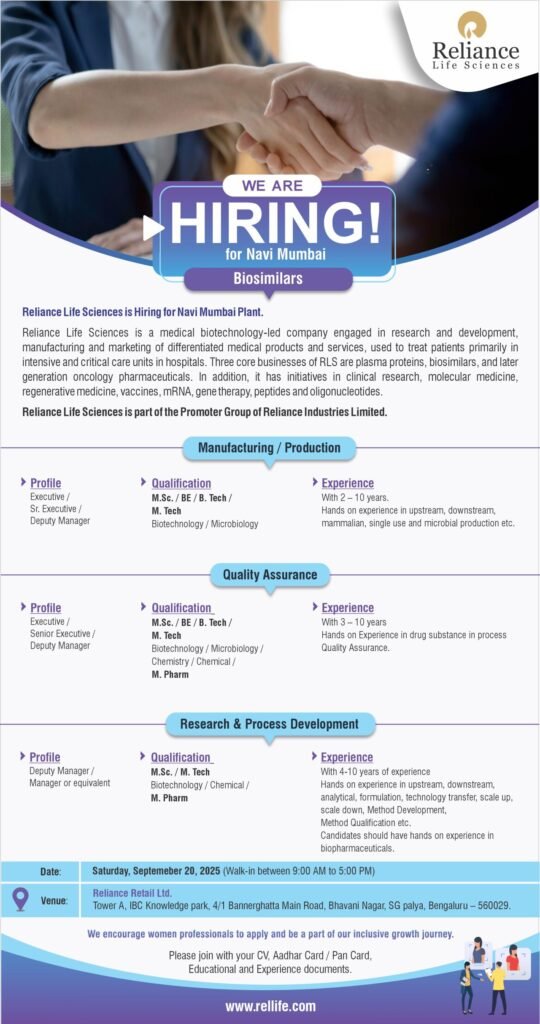Walk-in Hiring Drive at Reliance Life Sciences – Bengaluru!