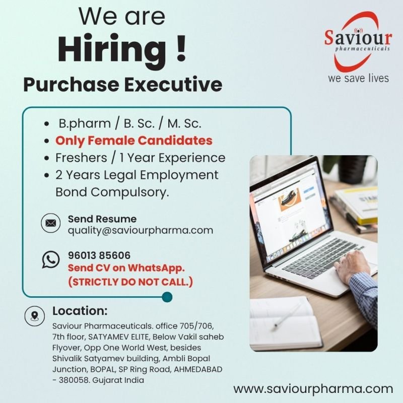 Saviour Pharmaceuticals is hiring for Purchase Executive Department(freshers & Experienced)