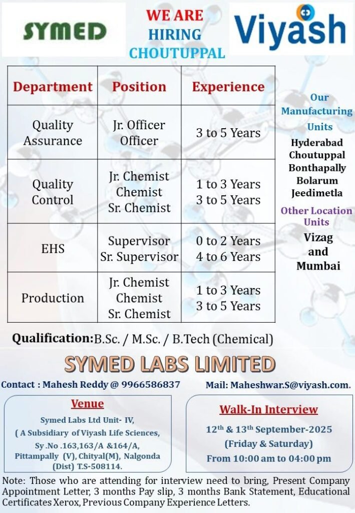 Venue: Symed Labs Ltd Unit- IV, (A Subsidiary of Viyash Life Sciences, Sy.No.163,163/A &164/A, Pittampally (V), Chityal (M), Nalgonda (Dist) TS-508114.
