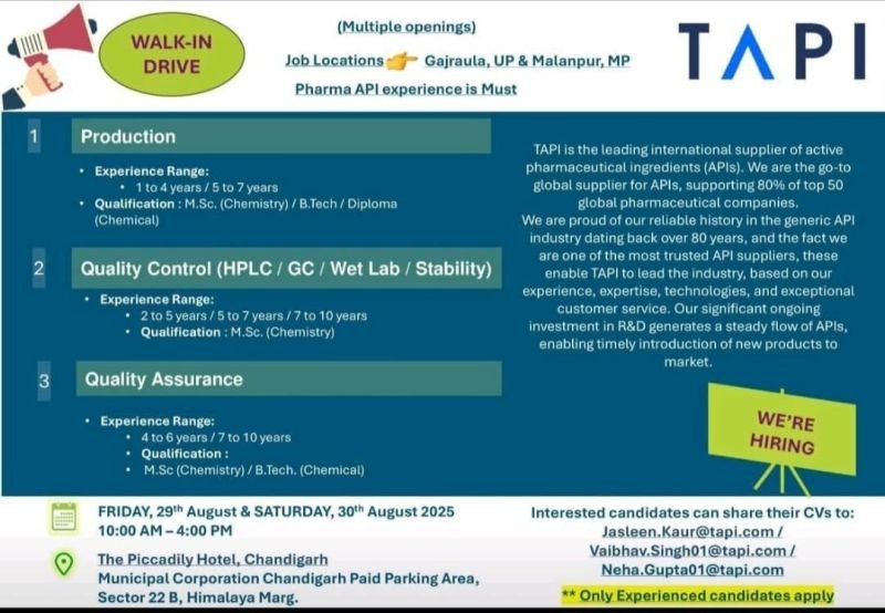 TAPI, a global leader in Active Pharmaceutical Ingredients, is hosting a Walk-In Drive for multiple roles across Gajraula, UP & Malanpur, MP!