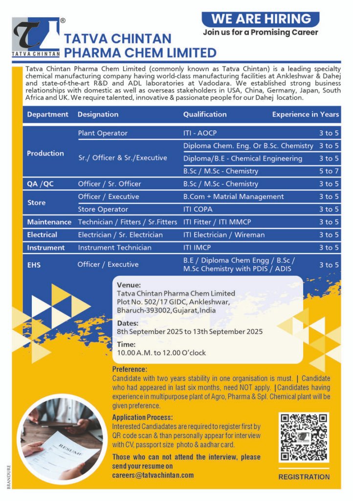 Tatva Chintan Pharma Chem Ltd is hiring for multiple positions in multiple departments