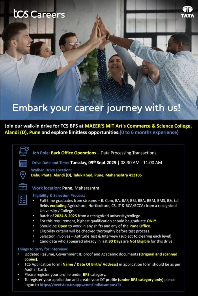 TCS BPS Walk-in drive for Arts, Commerce, Science and Management graduate freshers from 2024 and 2025 batch passouts freshers only.