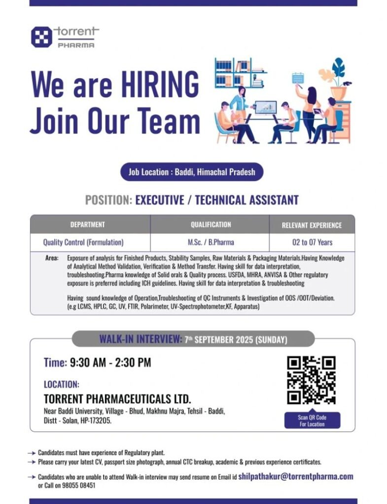 Let’s come forward to attend walk-in-interview at Torrent Pharma Baddi for HPLC EXECUTIVES on 07/09/25 (Sunday)