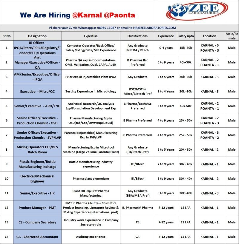 Pl share your CV via WhatsApp at 98969 11987 or email to HR@ZEELABORATORIES.COM