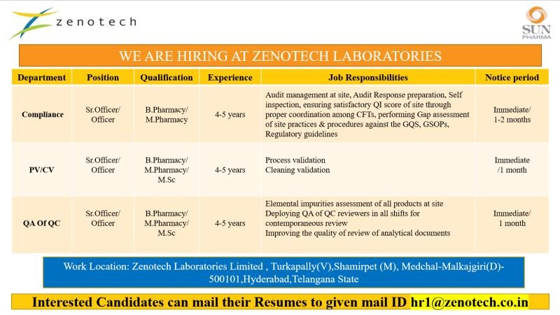 We are looking for the Dynamic, professional & Experienced Candidates to be a part of our Zenotech Laboratories Limited, a subsidiary of Sun Pharmaceuticals Limited at Turkapally , Hyderabad. The following positions are available now in Quality Assurance.