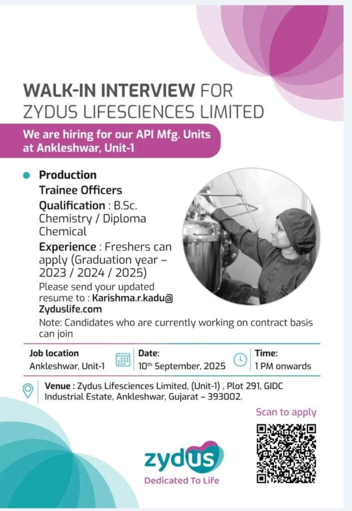 WALK-IN INTERVIEW FOR ZYDUS LIFESCIENCES LIMITED
